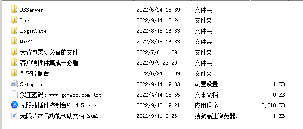 打开解压后的功能插件目录有包含 DBServer、LoginGate、Mir200、引擎控制台,四个文件夹,如下图: