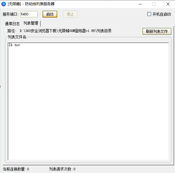 服务端口可默认或任意无占用的端口均可,然后启动并在列表目录中创建你的列表文本(如:lb.txt),此时你的列表地址就是 http://服务器外网IP:服务端口/lb.txt 但这个地址无法在浏览器中访问,只能配置好登录器后打开登录器才能直接访问,此方法于1中的服务器IP代替域名方法一致。