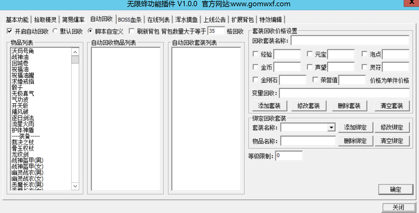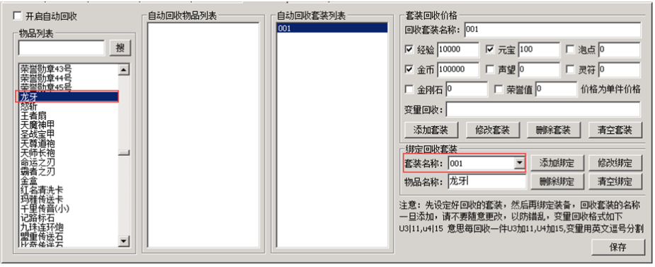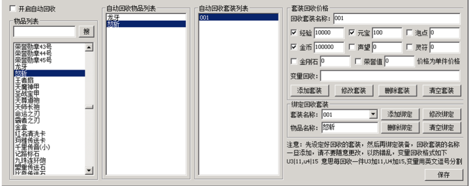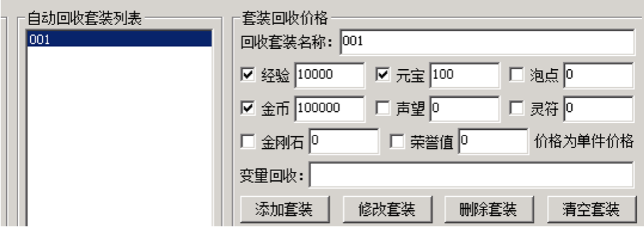 这里套装001,回收给元宝是100,意思是,龙牙回收=100元宝,怒斩回收也是100元宝,这个设置的回收价格是每一件单件的价格。