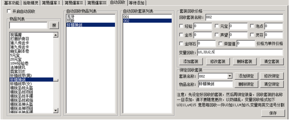 然后设置下这个套装,他回收的时候给多少元宝或者经验